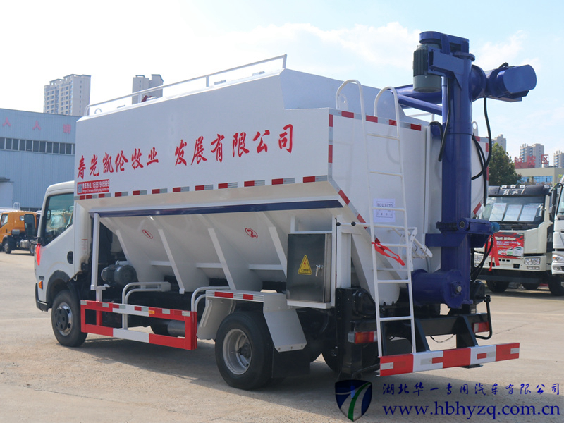 上装配置:罐体采用武钢专用容积板制作,厢体有效容积12立方,分2仓(可同时装运两种饲料),全车叁根绞龙,顶部一根长度为6.5米,绞龙电压380伏,3个电机功率5.5千瓦,一个液压减速机,带15米电缆,散装饲料车的饲料罐架设在卡车的底盘上,罐顶开有进料口.顶部的一根螺旋输送卸料管(俗称卸料绞龙)则可自由回转和抬升,抬升的仰角可达60度。运输时,顶部的螺旋管平卧在罐顶;卸料时则抬起,使管端的出料口与畜禽饲养场贮料罐顶部的进料门相接,驾驶室内装有操纵装置(操纵装置也可装置在罐体尾部),卸料时通过车底的动力输出轴和减速器来驱动螺旋,以完成卸料。