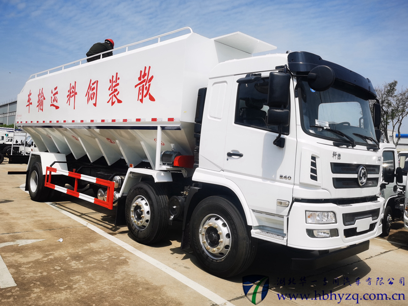 工作原理:散装饲料车的饲料罐架设在卡车的底盘上,罐顶开有进料口,顶部的一根螺旋输送卸料管(俗称卸料绞龙)则可自由回转和抬升,抬升的仰角可达60度。运输时,顶部的螺旋管平卧在罐顶,卸料时则抬起,使管端的出料口与畜禽饲养场贮料罐顶部的进料门相接,驾驶室内装有操纵装置(操纵装置也可装置在罐体尾部),卸料时通过车底的动力输出轴和减速器来驱动螺旋,以完成卸料。目前国内主要推出3T、5T、8T、11T、15T和22T等多个吨位车型。垂直卸料高度8.5米,整车卸料完用时30分钟内。