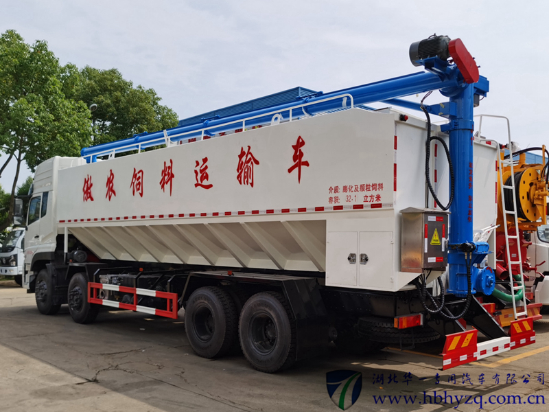 3、采用三相380伏电动绞龙卸料,卸料速度每分钟1立方或0.6吨以上,卸料水平距离6.5米,卸料高度8.5米左右(也可定做加长), 完全满足养殖基地饲料塔的灌装需要。底盘按东风公司标准实行三包,上装三包期壹年。