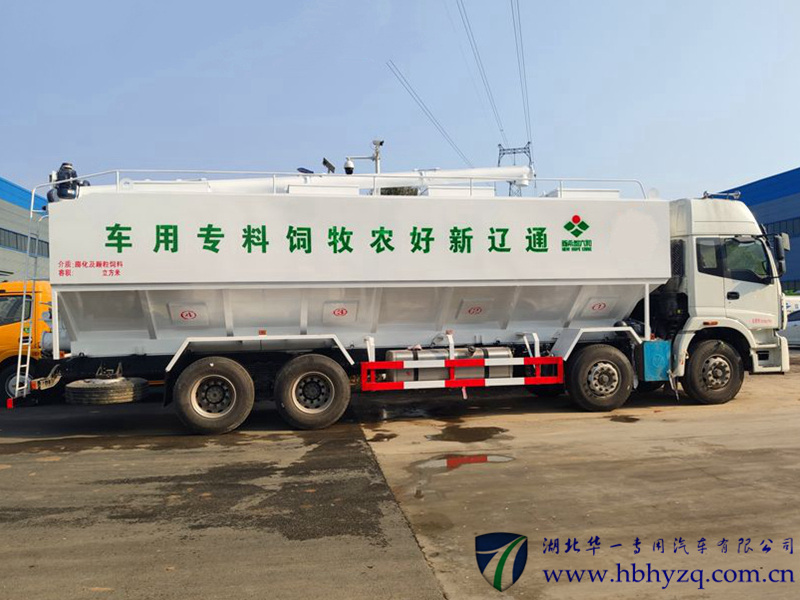 上装配置:罐体容积40立方,分4-5仓,全车叁根绞龙,绞龙电压380伏,3个电机功率5.5千瓦,一个液压减速机,带15米电缆,散装饲料车的饲料罐架设在卡车的底盘上,罐顶开有进料口,顶部的一根螺旋输送卸料管(俗称卸料绞龙)则可自由回转和抬升,抬升的仰角可达70度。